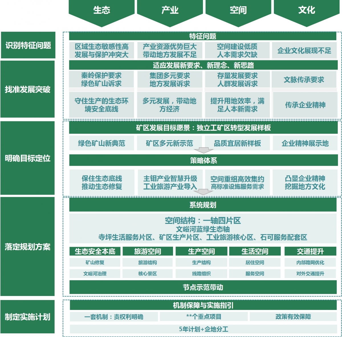 在新时期高质量发展的背景下,矿区面临的诸多挑战日益突出。首先,秦岭生态保护作为“国之大者”,需要矿区对未来高质量发展的路径进行系统谋划;其次,技术进步带来的生产空间需求转变,对矿区空间优化调整提出了新要求;另外,矿区功能失活、品质低下等问题亟待解决。因此,本次规划肩负着梳理矿区发展思路,谋划转型发展蓝图和空间优化利用的系统任务。